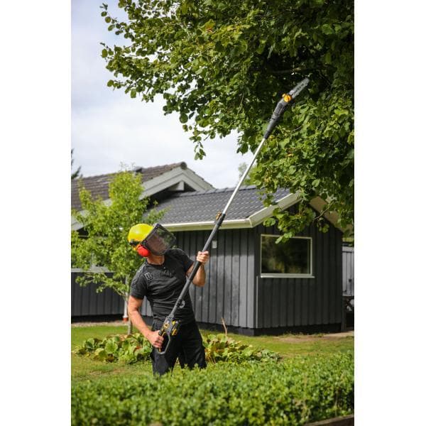 PCX2000 di TEXAS è una motosega telescopica a batteria e puoi facilmente regolare la lunghezza totale dell'albero telescopico tra 192 e 259 cm senza attrezzi. Ciò significa che con questa sega telescopica potrete raggiungere i rami più alti di alberi e cespugli, rimanendo allo stesso tempo sicuri a terra. Con un peso di soli 3 kg (senza batteria) e la cinghia inclusa avrete a disposizione una comoda sega ad asta con cui lavorare.