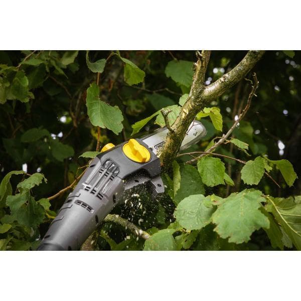 Il PCX2000 ha una barra da 8" (19 cm) e la sega per rami può gestire rami di diametro simile: la barra e la catena provengono dall'Oregon, USA. Il fermacorteccia sul lato inferiore della testa della sega garantisce un buon supporto sul ramo durante il taglio e poiché la sega è dotata di lubrificazione automatica della catena, la funzionalità è di prim'ordine. La batteria inclusa per questa motosega telescopica può ovviamente essere utilizzata per altri prodotti